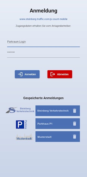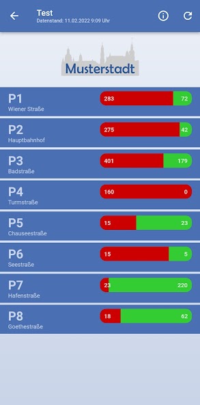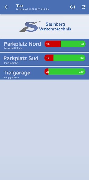 The app is universal, the occupancy data of car parks and parking garages. Both urban and local parking data acquisition systems are supported. A list of parking acquisition systems, see http://www.steinberg-traffic.com/p-count-mobile. The assignment display is easy to read as a red-green-band or numerically.
