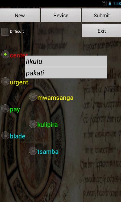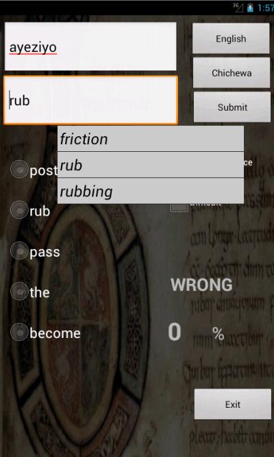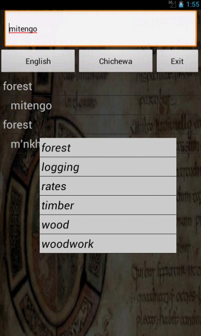 Chichewa English Dictionary - Dicionário de viagem para traduzir Chichewa para inglês exibindo uma lista de palavras em inglês. O dicionário também se traduz do inglês fonético para Chichewa. Copiar uma palavra da lista traduzida para uma tradução reversa pode ser usada para encontrar sinônimos e entender o uso mais amplo da palavra em inglês na língua Chichewa. Embora o Dicionário Inglês de Chichewa não forneça definições ou exemplos, o uso do software de tradução dessa maneira fornece um mecanismo para entender melhor as palavras em inglês no contexto de Chichewa sem a necessidade de definições. 20k Referências.