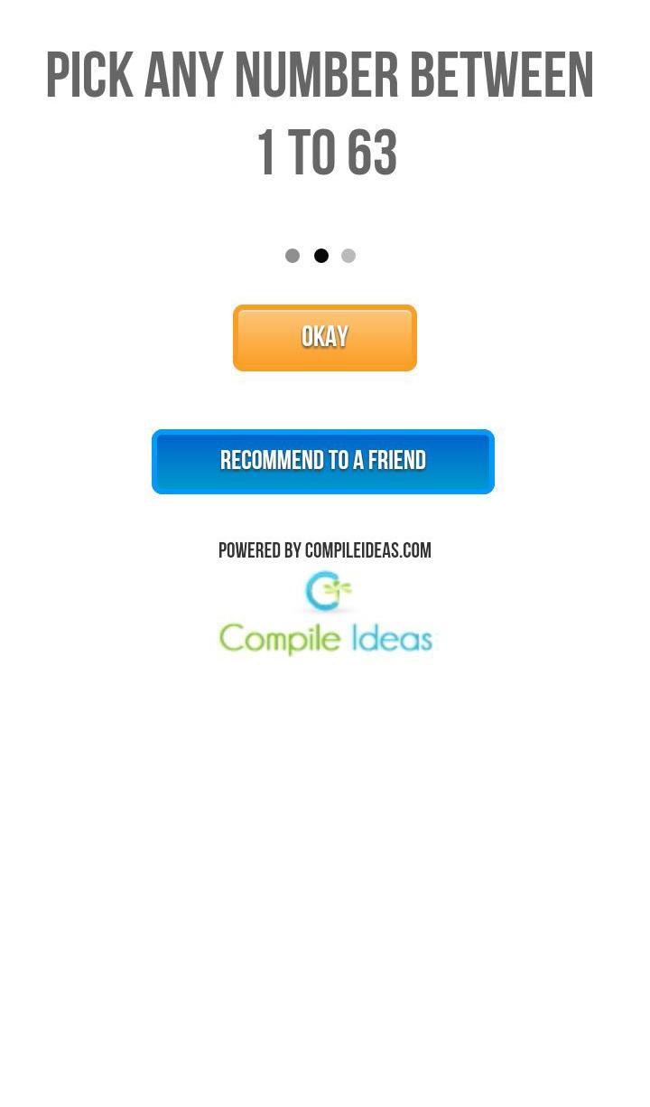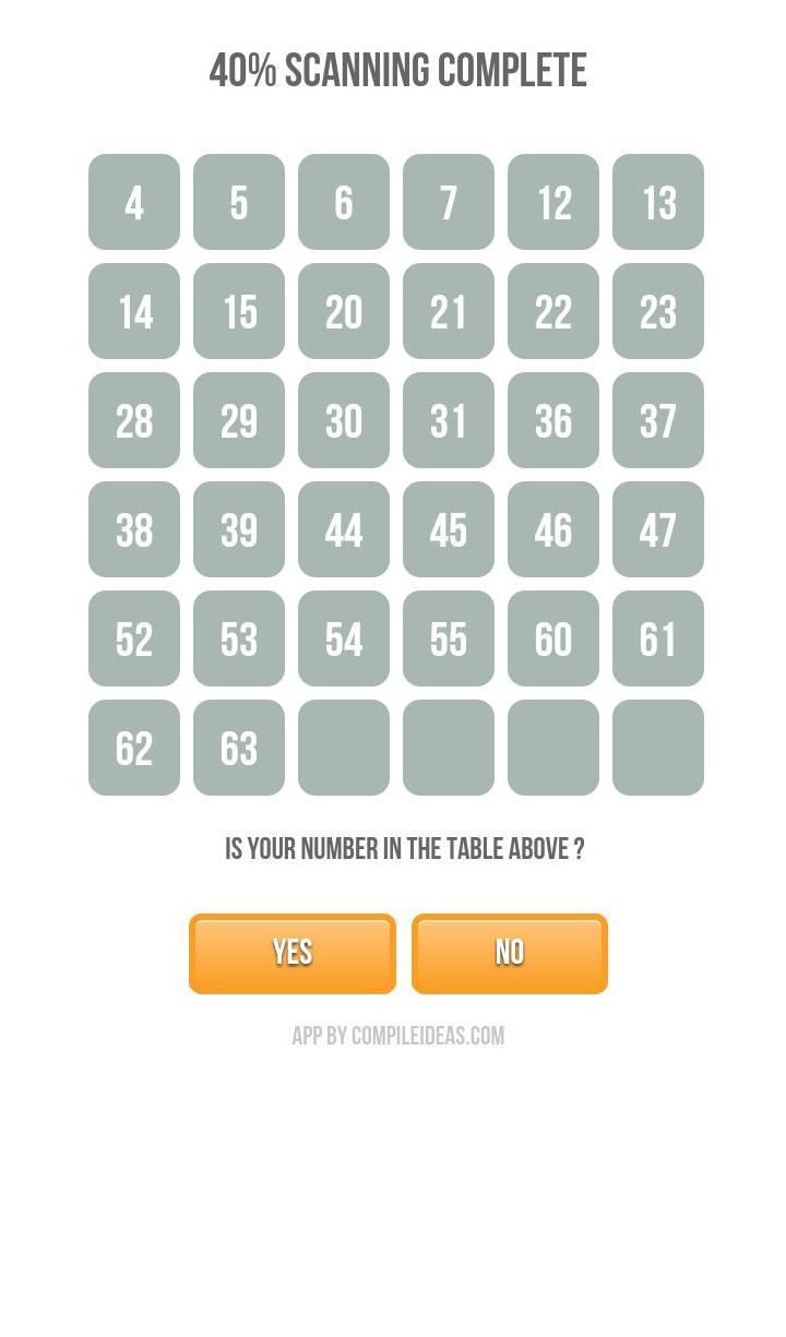 Você pensa em um número entre 1 e 63. O aplicativo mostrará 6 slides. Se o seu número estiver no slide, clique em Sim. Caso contrário, clique em No. No final, ele adivinhará seu número.Bug corrigido- Saída errada quando o usuário escolhe o número 56