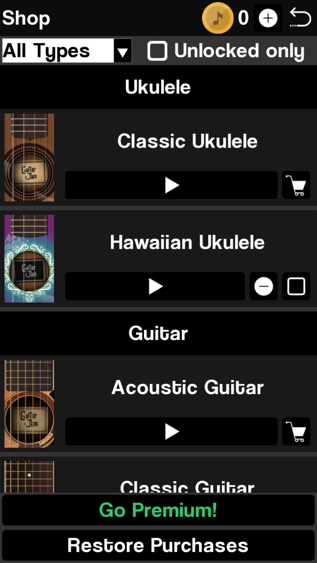 Guitar, bass, ukulele, banjo and even charango are available to play in this app