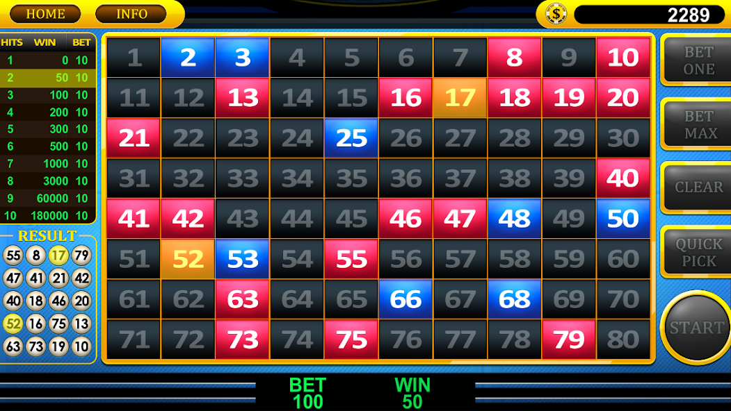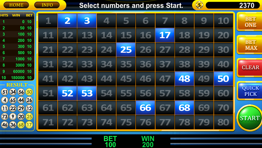 The player is given a ticket with 80 numbers on it. He picks 1 to 15 numbers on the ticket. 20 winning numbers are selected randomly. The more of the player's picks that are selected, the bigger the payout.