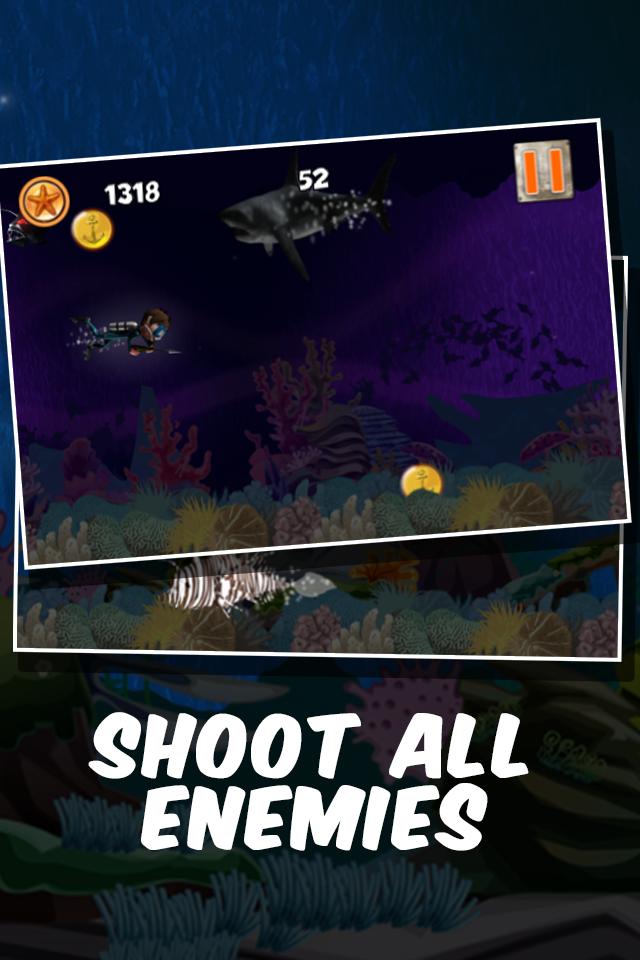Глубоко в океане скрывают акулы, электрические угри и вредные кальмары. Вы далеко от поверхности, и ваша единственная защита - это пистолет. Вы готовы? Вы можете оставаться в безопасности? Остерегайтесь акул и кальмаров. Используйте свои копья, чтобы защитить себя. Соберите золотые монеты и звезду, чтобы разблокировать новых персонажей дайвинга.