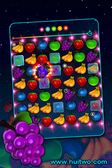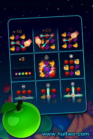 Чем более натянуты фрукты, тем более высокие оценки. Вы войдете в режим высокой оценки, если вы сможете избавиться от фруктов в течение пяти раз в течение определенного периода времени. Ваш счет будет удвоен и удвоен в сочетании с различными фруктовыми реквизитами.