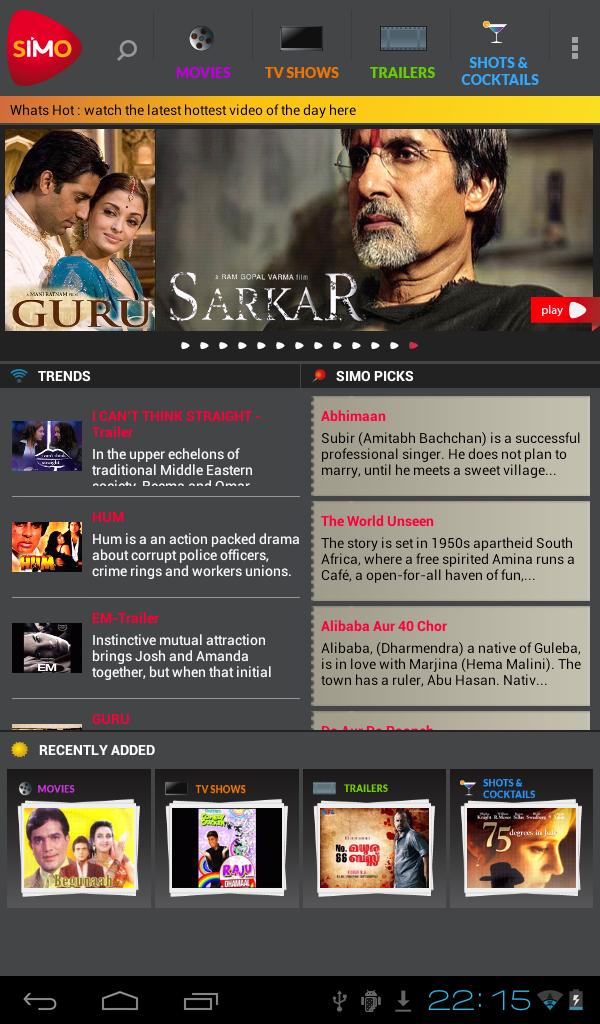 Download SIMO for your Android phone or tablet running Android 3.0 or later. Browse and instantly watch any video – movies, trailers and TV shows. We bring an incredible diversity of genres to you. Full length feature films including top-notch US independent titles, award-winning international films from India, Europe, Middle East and Latin America, and the classic films, all on demand for our audiences worldwide!