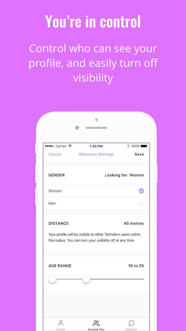 Shared locations often mean shared interests. By only showing your profile to people within 45 metres of your current location, Tanndem helps you meet and connect with real people around you, in real time.