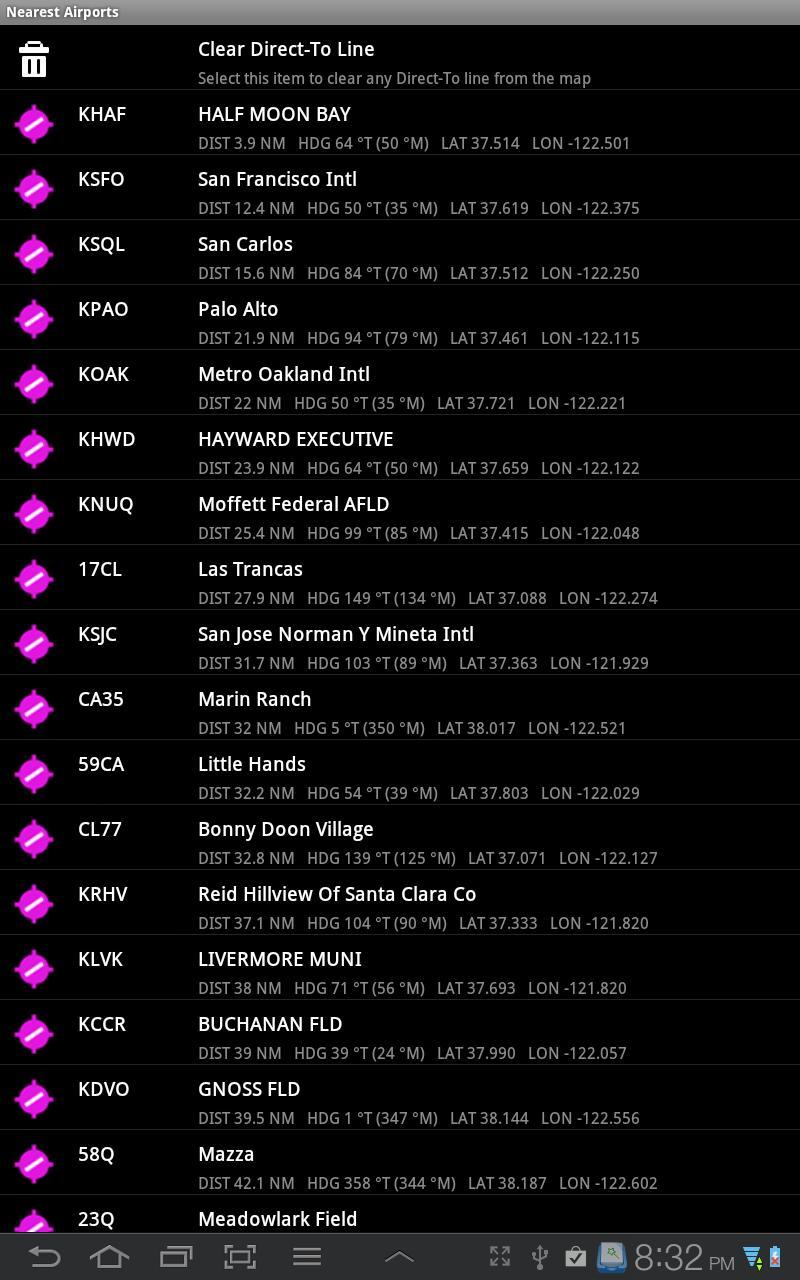 - การค้นหาสนามบินที่ใกล้ที่สุดรวมถึงระยะทางและมุ่งหน้าไปยังสนามบินสิ่งอำนวยความสะดวกเครื่องบินและลานจอดเฮลิคอปเตอร์