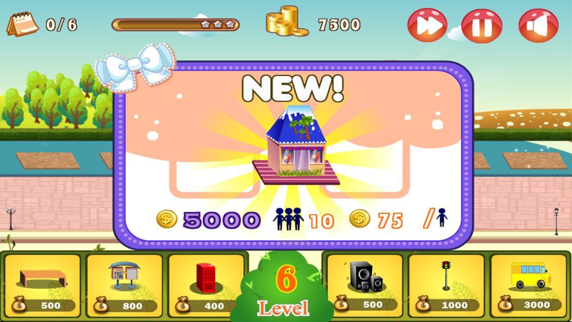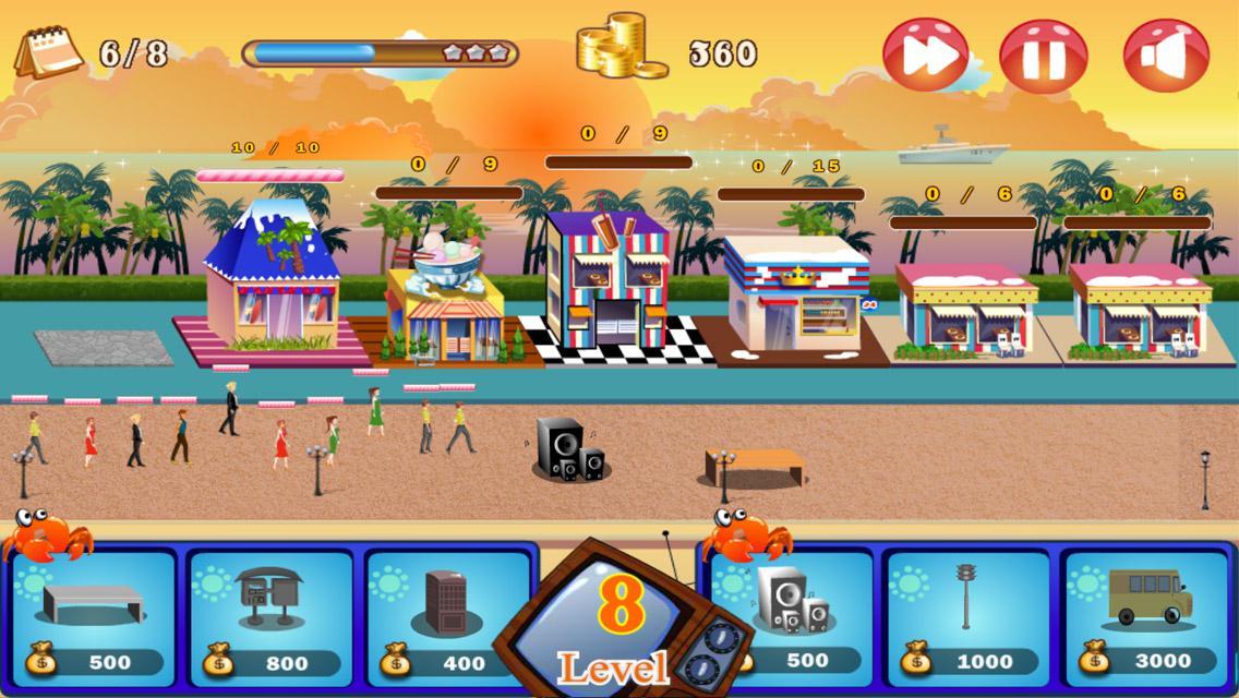 ใน Shopping Street งานของคุณคือการตกแต่งแหล่งช้อปปิ้งในเมืองเล็ก ๆ ของคุณด้วยร้านค้าสุดเก๋ร้านอาหารและร้านบูติก คุณเริ่มต้นด้วยบิสโทรขนาดเล็กที่มีที่นั่งเพียงไม่กี่ที่นั่งและให้ผลกำไรเพียงเล็กน้อย เมื่อคุณบรรลุวัตถุประสงค์ที่ให้ไว้คุณจะได้รับงบประมาณที่สูงขึ้นในระดับต่อมา