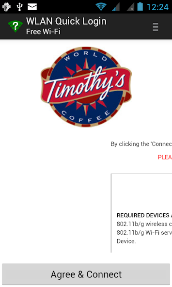 WiFi Quick Login ทำให้ง่ายและง่ายต่อการเข้าสู่ระบบฮอตสปอต WiFi สาธารณะและเครือข่ายแขก คลิกปุ่มหนึ่งปุ่มยอมรับข้อกำหนดและเงื่อนไขโดยอัตโนมัติเติมรหัสผ่านที่จดจำได้และลงชื่อเข้าใช้คุณไม่มีหน้าจอเลื่อนเพื่อค้นหาปุ่มอีกต่อไป ไม่มีรหัสผ่านซ้ำอีกต่อไปไม่มีการเปิดเบราว์เซอร์เพื่อเข้าสู่ระบบก่อนที่จะตรวจสอบอีเมลของคุณ