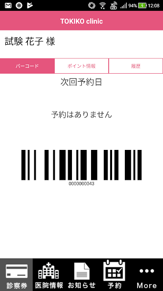 It can be used as a cardless examination ticket, such as a check-in function that can be accepted by simply holding the barcode, and displaying the date and time of the next reservation.