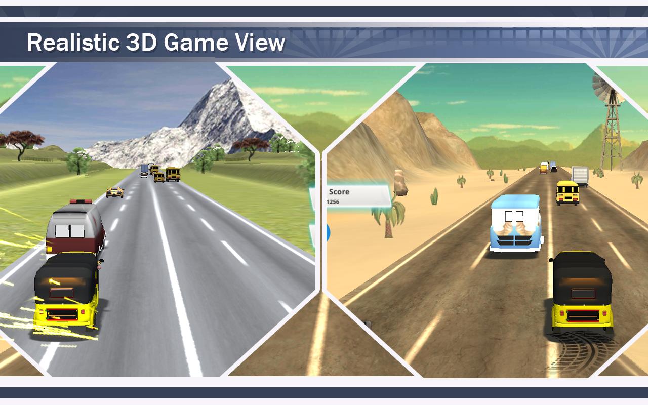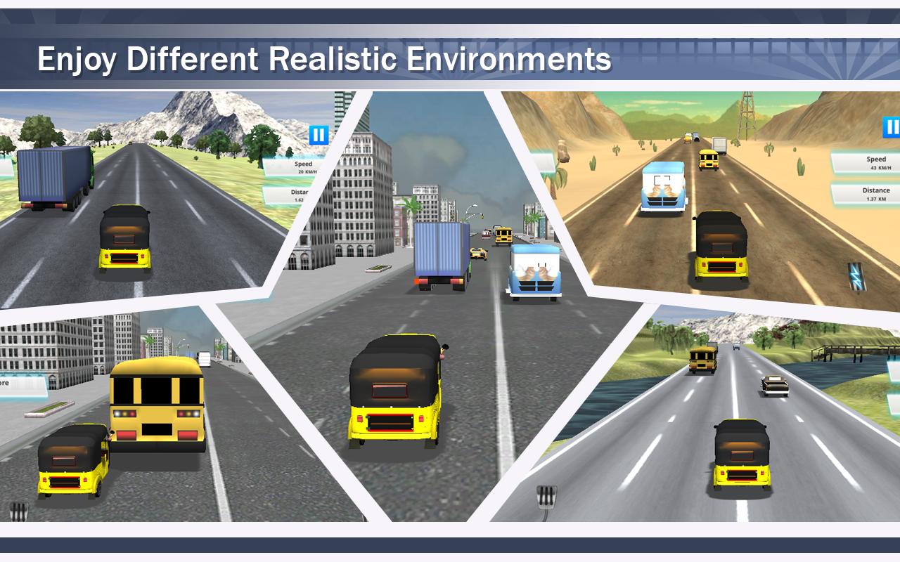 1. Highway auto rickshaw game provides 3d simulator of highway traffic. Drive the auto rickshaw in a crowdy highway. Test your highway racing skills with steering and accelerator. Keep away from the cars and trucks coming in your direction. Check your score while clearing the levels in the scoreboard.