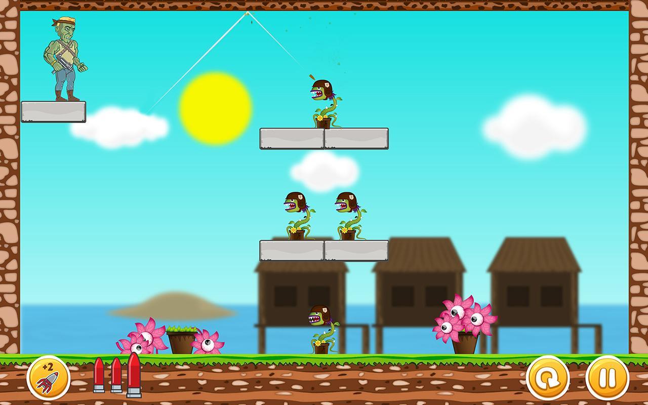 The rules for this free undead game are simple – aim and fire and hope the bullets will go your way! The bullets bounce off everywhere, try using as less as possible to finish with the bloody monster plants in this extremely fun arcade shooting game! This is a real plants war against undeads – if you are stupid, plants will end you! You guys should prove you aren't stupid undeads, and be the smartest undead with a good strategy that can kill all the plants and save your ammo!