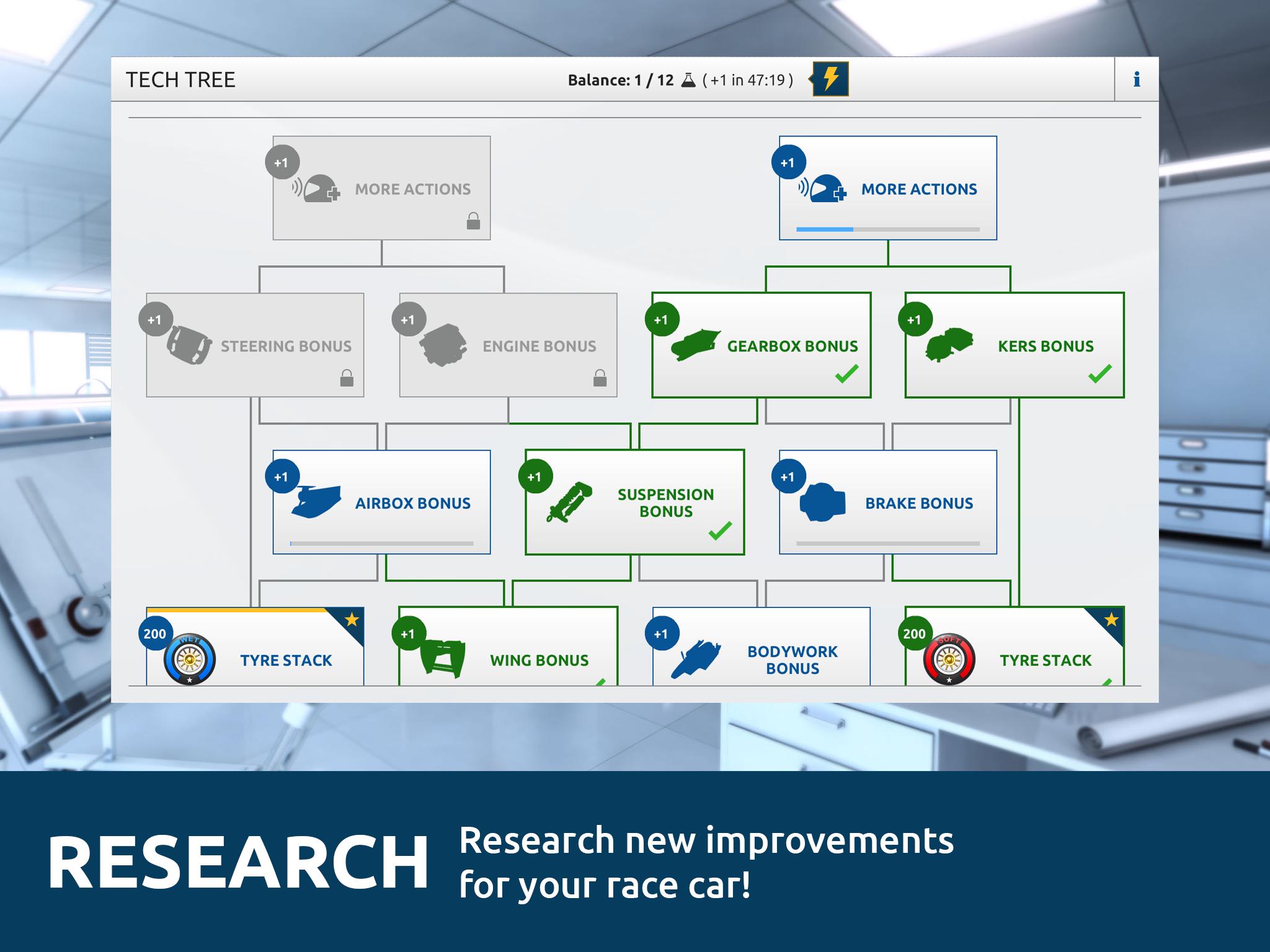 * Research – Features and bonuses like engine power, production times and component wear can be researched and are always visible in the Tech-tree.