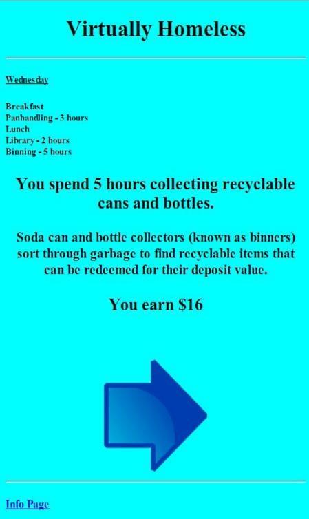 A homeless simulation game. The game is modeled on real-life facts and research. You have lost your home (for whatever reason) and are now facing homelessness. In the game, you select a startup financial situation as you enter homelessness. You then live each day like a homeless person, and you can always track your situation (how many days you have been homeless, how many times you have slept on the street). The game is designed such that a person facing homelessness can learn what their life may be like once they actually become homeless. It is assumed that you are a single person with no dependent children (90% of homeless people are). Just like real life, some aspects of the game are determined by a random number that the software generates (e.g. you need to walk *40* minutes to get to a homeless shelter for the night, or, you made *$12* in 3 hours of panhandling).