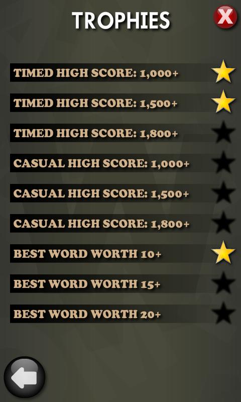 High scores, statistics, trophies, and your all-time best word are saved throughout the game. Potentially unlimited games in Free Play mode. Choose from Timed to Casual gameplay. Challenge yourself in Free Play mode by choosing the length of each round in play from 2 minutes down to 30 seconds. Can you beat the clock or fall under the pressure? The grammatical possibilities are endless!