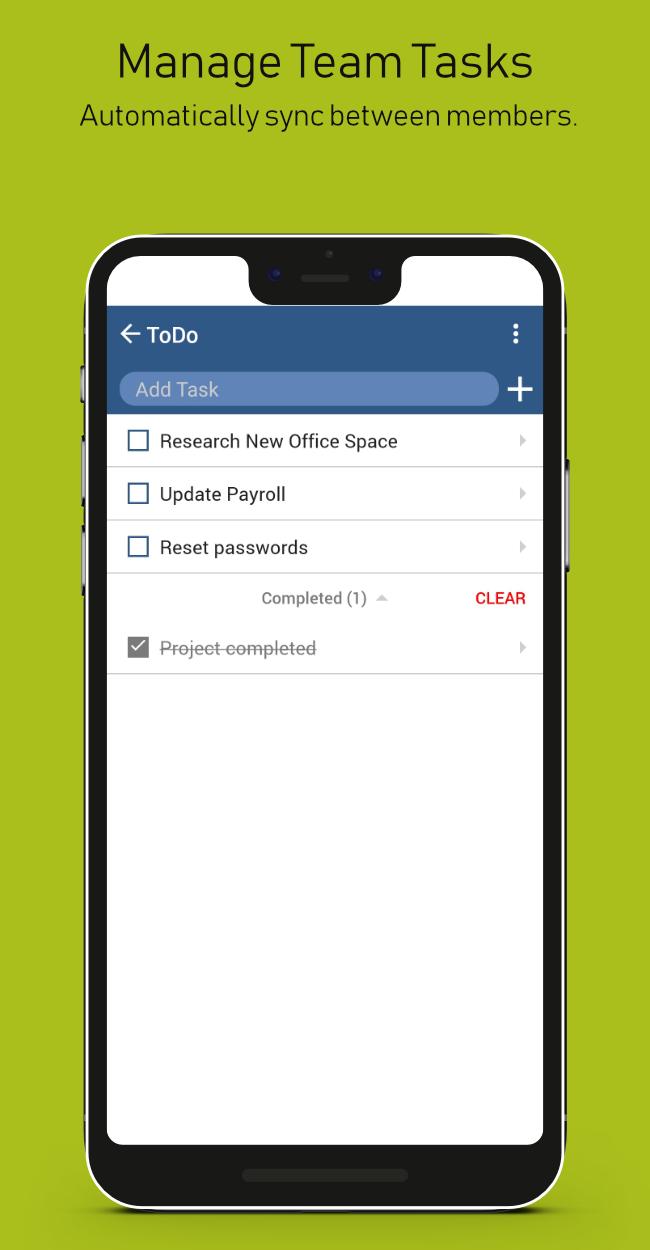 Create tasks and lists to manage everything that needs to be done. Tasks are automatically shared to other team member's devices and can be assigned, given due dates, repeated and more.