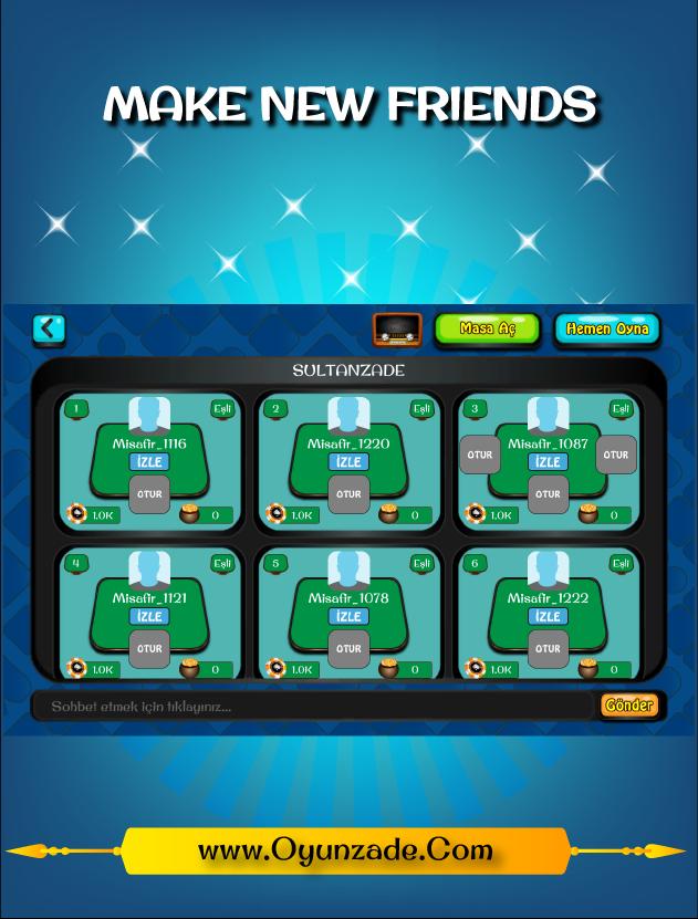 您可以使用您的Facebook帐户或Oyunzade.com帐户加入。您可以在玩游戏时扩大社交网络。您可以选择玩游戏的轿车。您可以选择打开表选项,并邀请您的朋友到桌子上。您可以与朋友进行私人聊天。