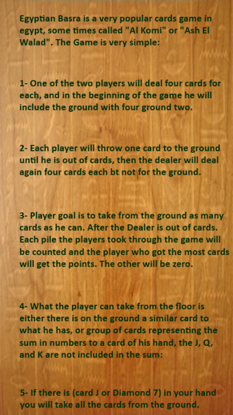 Egyptian Basra是埃及的一款非常受欢迎的卡片游戏,有时称为“ Al Komi”或“ Ash El Walad”。游戏非常简单:
