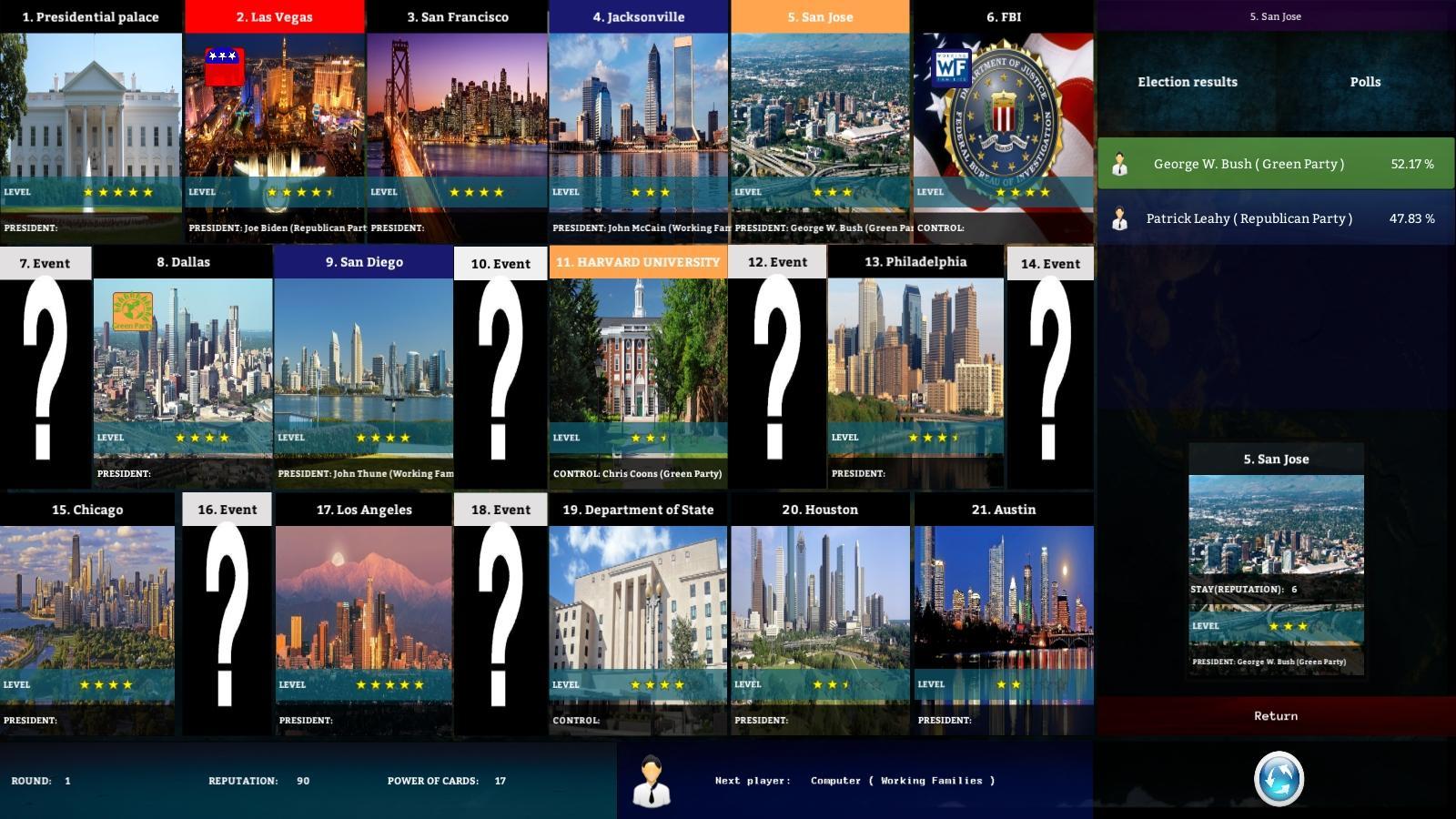HOD是一款策略游戏,您尝试击败其他玩家。该游戏具有政治现实。我们收到的卡被放置在我们选择的位置。每次举行选举,都会遵循候选人之间的斗争。游戏宽松地基于原理垄断。