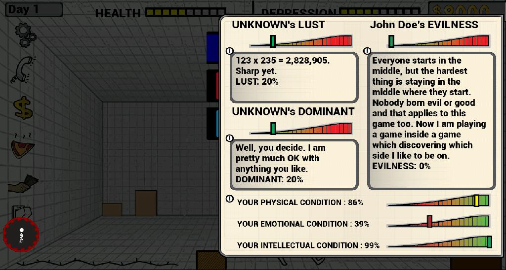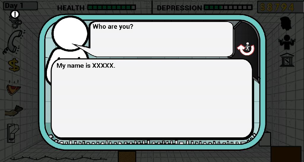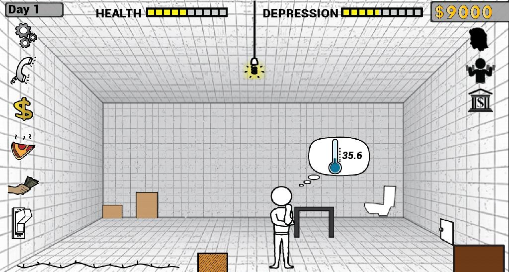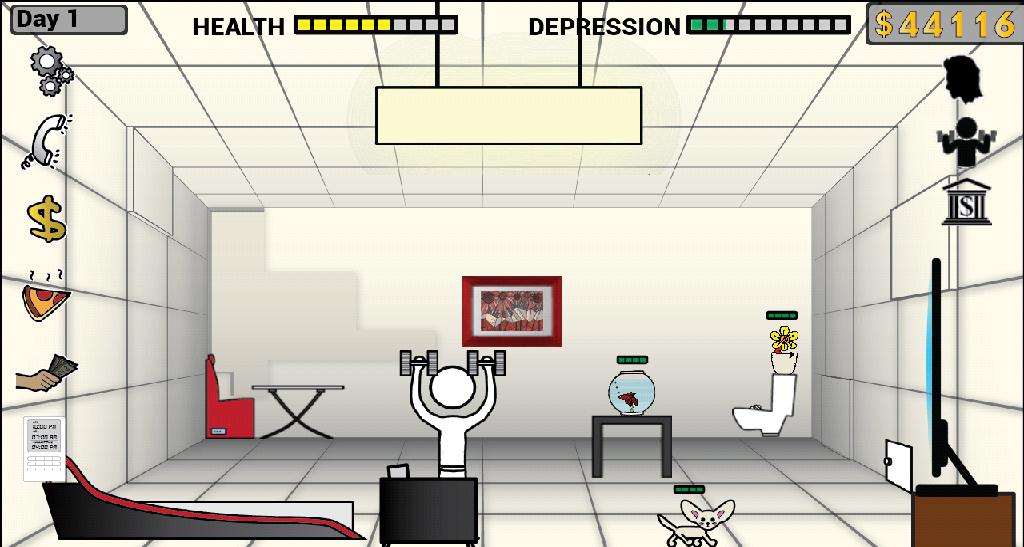 您掌握了他一生的钥匙,因为您只能得到食物或东西为他生存。给他购买可以提高健康水平并降低抑郁水平或升级家具的食物,这将不断降低他的抑郁水平或其他两种状况。