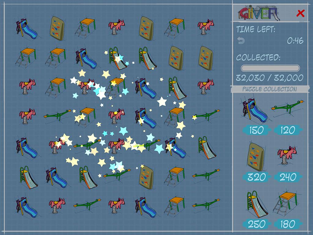如果成功排隊三件或更多件,它們將被從遊戲板上取下,並自動與新的交換。有時,這會導致鏈條效應,從而導致額外的作品排列。玩家必須至少收集每種類型的一部分才能設置操場。每件物品的資金美元價值價值一定數量,必須滿足固定金額。玩家必須在計時器用完之前達到這些目標。